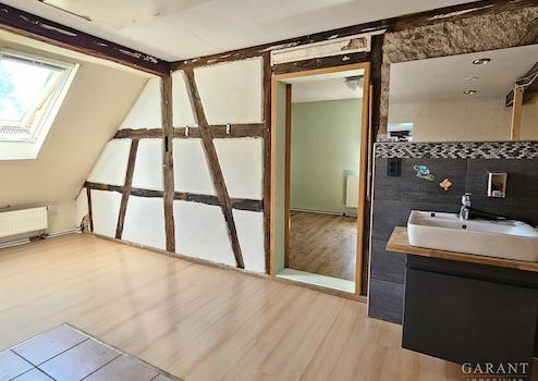 Im OG mit seiner Deckenhöhe von 2,80m befindet sich die sehr großzügige Wohnküche mit stattlichem Holzofen, sowie im ehemaligen Ratszimmer ein XXL Wohn-Esszimmer und das Badezimmer.