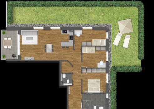 Sämtliche Illustrationen sowie die eingezeichneten Möbel, Küchen und Ausstattungen sind nur Beispiele und daher auch kein Vertragsbestandteil. Visuelle Darstellungen können von der finalen Ausführung abweichen. Alle Unterlagen, Pläne und Flächenangaben sind auf Basis der Baupläne Stand Mai 2023. Diese sind nicht zur Maßentnahme geeignet. Änderungen auch noch während der Ausführung bleiben vorbehalten.