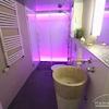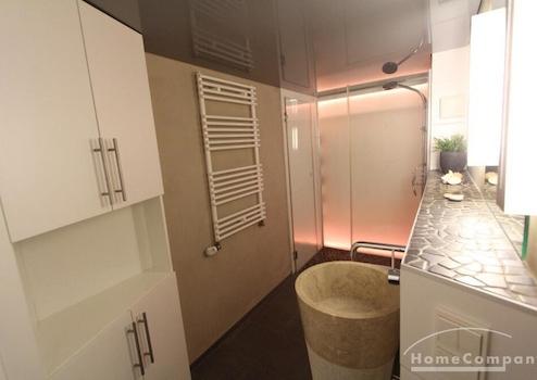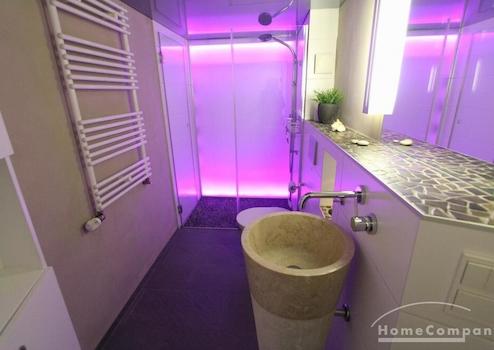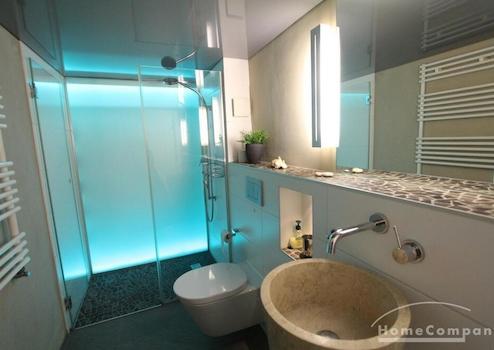 Bad: Ein Highlight auf nur 4,4 m²! Das luxuriöse Designer-Badezimmer verfügt über eine Lichtwand, eine Spanndecke, einen freistehenden Waschtisch und eine bodenebene Dusche.