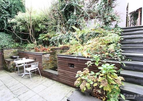 Terrasse: Die ca. 16 m² große Terrasse ist ein privater Rückzugsort mit Brunnen und Wasserfall sowie stimmungsvoller Beleuchtung - ideal zum Entspannen im Freien.