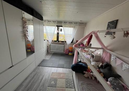 Geht man den Flur entlang, kommt man an einem Abstellraum mit eingebauten Regalen vorbei und kommt dann weiter in ein helles Kinderzimmer/Büro. Der Raum bietet genügend Platz für einen großen Schreibtisch, oder für ein großzügiges Kinderzimmer.