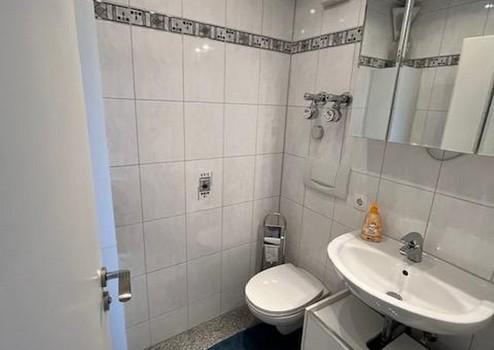 Als nächstes kommt das WC mit Toilette und Waschbecken. Der Raum ist mit modernen/zeitlosen Fließen gefliest.