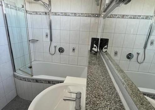 Vom Schlafzimmer aus über den Flur kommt man mit warmen Füßen in das Badezimmer mit Fußbodenheizung und großer Badewanne mit Duschabtrennung. Die Fußbodenheizung beginnt im Flur vor der Schlafzimmertür und führt ins Badezimmer. Das Badezimmer verfügt noch über einen großen Handtuchheizkörper.