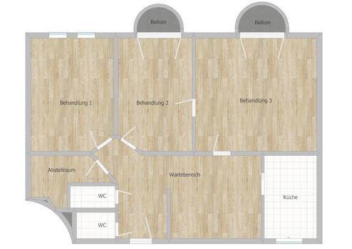 Diele mit Wartebereich, 3 Behandlungszimmer, 2 WC-Anlagen, Küche, Abstellraum, zwei Balkone