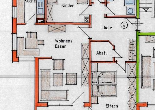 Diele, Abstellraum, Bad, sep. WC, Wohn-Esszimmer mit Balkon, Kinderzimmer, Schlafzimmer, Küche.