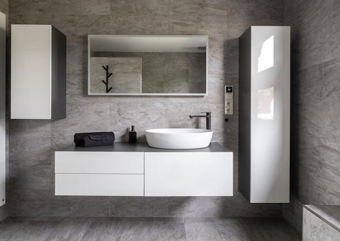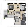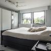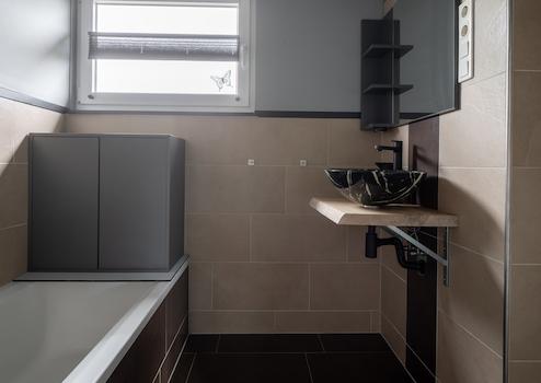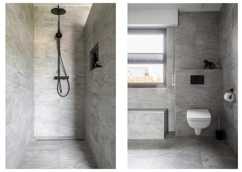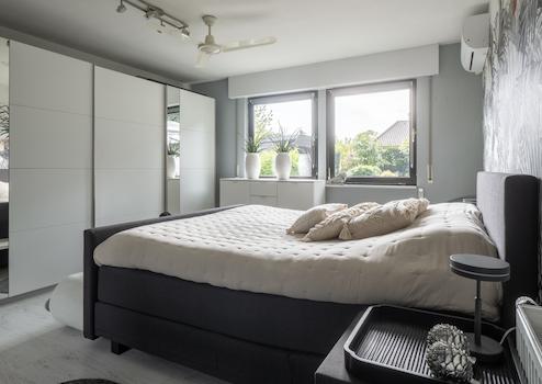 Das Hauptschlafzimmer verfügt über ein eigenes Badezimmer en suite mit Fußbodenheizung, ist mit einer Klimaanlage ausgestattet und bietet einen luxuriösen Komfort. Das zweite Schlafzimmer, ideal als Gästezimmer, ist ebenfalls geräumig und hell und verfügt über eine eigene Klimaanlage. Das zweite Badezimmer ist mit einer Badewanne, einer begehbaren Dusche und einem Waschbecken ausgestattet. Das Gäste-WC ist separat. Alle Räume sind hochwertig und modern gestaltet.