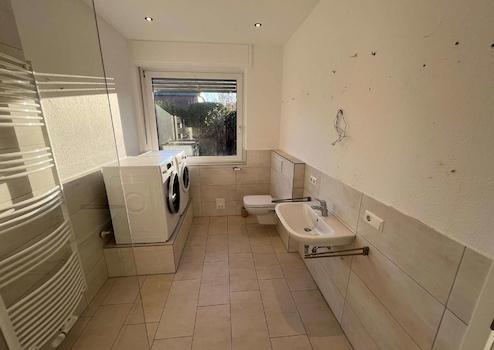 - Badezimmer: Ebenfalls vollständig renoviert, mit stilvollen, hellen Fliesen. Neben einer ebenerdigen Dusche mit Glasabtrennung gibt es auch eine erhöhte Plattform mit Waschmaschine und Trockner – eine durchdachte Lösung für zusätzlichen Komfort.