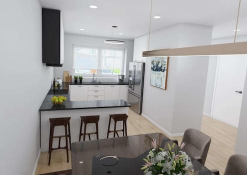 - Erdgeschoss: Hier finden Sie den Flur, der direkt zum Gäste-WC und dem Hauswirtschaftsraum mit Heizungsanlage führt. Auf der rechten Seite befindet sich die offene Küche mit Essbereich, die nahtlos in das lichtdurchflutete Wohnzimmer übergeht. Die Terrasse ist über das Wohnzimmer erreichbar und führt in den pflegeleichten Garten.