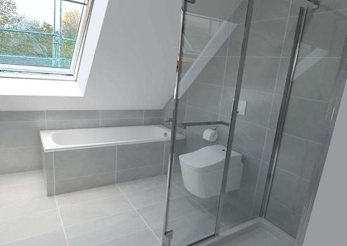 - Obergeschoss: Drei großzügige Schlafzimmer oder alternative Nutzräume sowie ein großes Badezimmer mit Dusche, Badewanne, Waschbecken auf einem Waschtisch liegend und hochwertigen Fliesen finden Sie hier.