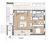 Sobald man diese Wohneinheit im Erdgeschoss betritt, fällt der Blick direkt auf die großzügige Loggia, durch die der offene Wohn- und Essbereich mit viel Tageslicht gefüllt wird. Damit befindet man sich auch im Herzstück der Wohnung mit ca. 40 m ², von dem aus alle anderen Räumlichkeiten zugänglich sind.