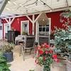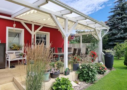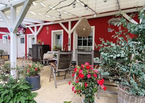Blickt man zum Haus, sieht man eine große Terrasse. Sie ist überdacht mit Platten, die das Licht durchlassen, den Regen aber aussperren. Die Terrasse befindet sich direkt vor der gemütlichen Küche.