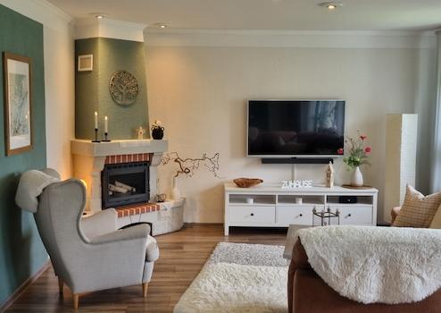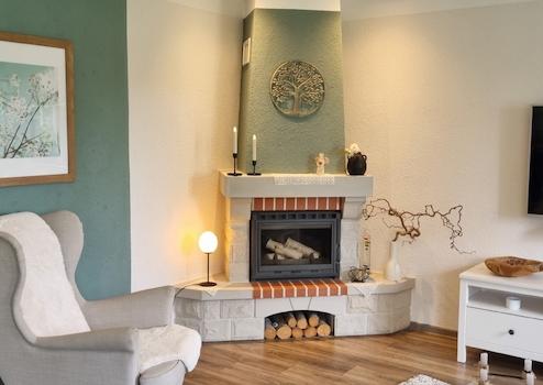 Im Wohnzimmer sehen Sie den schönen Kamin. Er macht es leichter, dass auch dieser Sommer irgendwann vorbei sein wird. Knisternde Scheite sorgen dann nicht nur für „Seelenwärme“ sondern sparen auch manchen Euro. Kaminholz bekommt man in dieser Gegend recht preiswert. Ganz egal, was Sie möchten. Ofenfertig geschnittenes Holz, auf Länge gesägte Stämme oder als Selbstwerber* im Wald. Sie haben die Wahl.