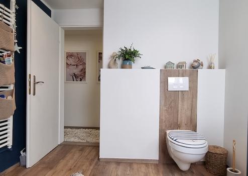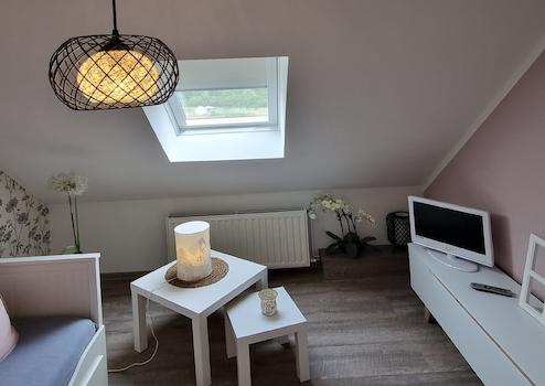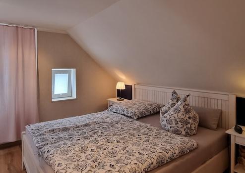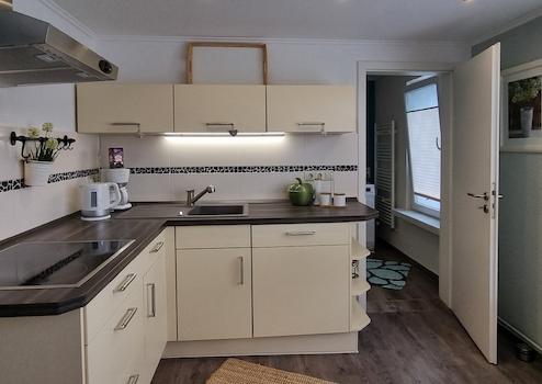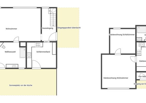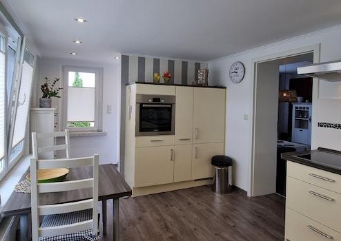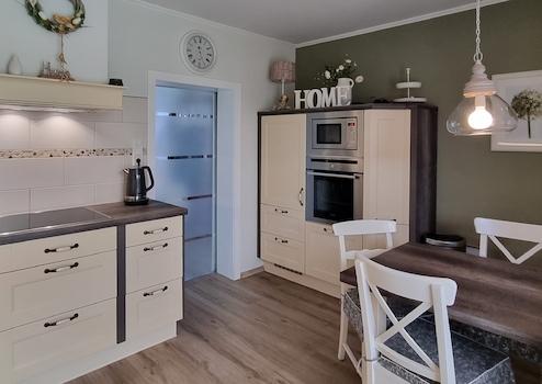 Sie erstreckt sich über den rechten Hausteil. Die Wohnung befindet sich im Erdgeschoss. Eine Einbauküche, ein Wohnzimmer, ein Schlafzimmer und ein Bad mit ebenerdiger Dusche sind hier. Zum Teil haben Sie , so wie auch in der Hauptwohnung bei der Küche und im Bad, eine kuschelwarme Fußbodenheizung (Neu 2017)