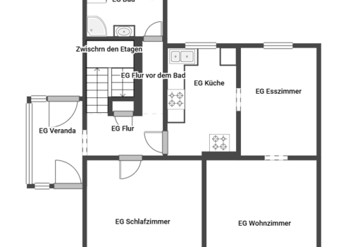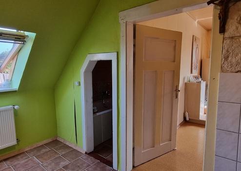Dieses Haus verfügt über alle Räume, die man auch im Alter auf der unteren Ebene braucht und möchte. Eine Veranda mit angrenzender Terrasse, um gleich am Eingang mit Erna, Julia oder Otto ein Kaffeeschwätzchen zu machen, ein helles, geräumiges Schlafzimmer, ein modernisiertes Bad, mit bequemer Dusche, eine Küche - sogar mit einem zusätzlichen Ofen, ein Esszimmer, falls es mal ein paar mehr Leute sind, die feiern möchten und ein Wohnzimmer. Im Wohnzimmer ist der Anschluss für den Kamin bereits vorbereitet. Suchen Sie sich Ihren Kamin aus und lassen Sie Ihre Freunde ein bisschen neidisch werden. Das ist noch nicht alles. Im Obergeschoss geht es weiter. Oben finden Sie eine Küche und, etwas ungewöhnlich, in der Abseite ein zweites Bad mit Wanne. Allerdings in sehr einfachem Standard und man bzw. sogar Frau, muss den Kopf einziehen. Die Tür ist ein bissl klein. Von der Küche kommen Sie dann in einen zentralen Raum. Hell und freundlich und sogar mit einem Kachelofen. Von diesem Raum gehen 2 weitere Räume ab. Ein Raum im Abseitenbereich bietet den Platz für Überraschungsgäste, die mal kurz übernachten wollen und der andere Raum ist ideal als 2. Schlafzimmer. Er muss kein Durchgangsraum bleiben, mittels einem einfachen Wanddurchbruch, könnte man auch vom oberen Flur, in das hinter Zimmer gelangen. Dann ist der Mittelraum mit weniger Türen.