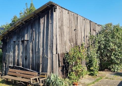 Das Nebengebäude ist nicht mehr so prickelnd könnte vielleicht noch aufgearbeitet werden. Eine Wellasbesthaube und an den Seiten sind breite, alte Holzbohlen - siehe Bild.