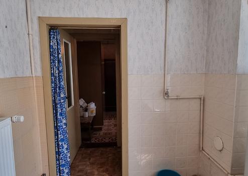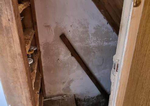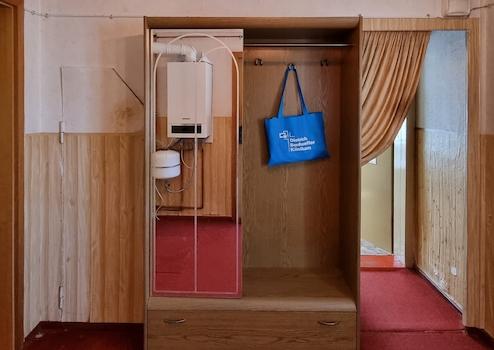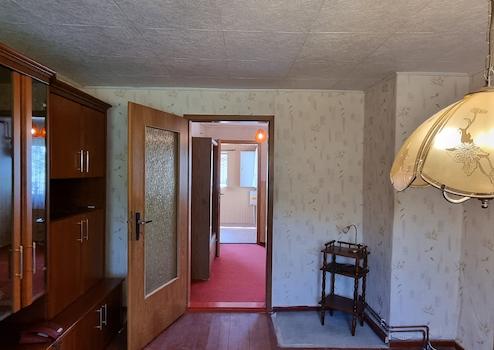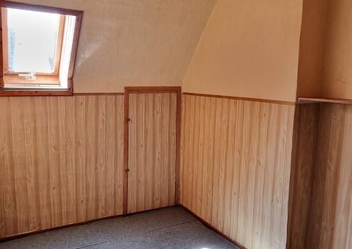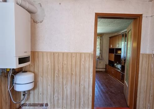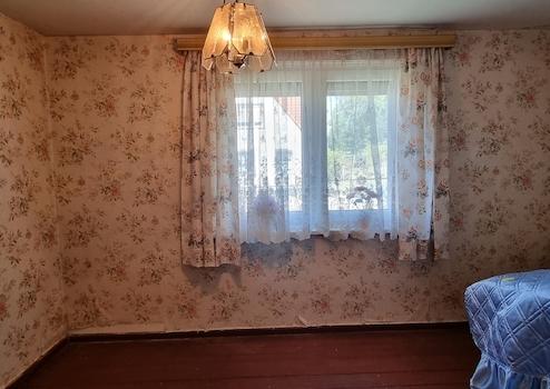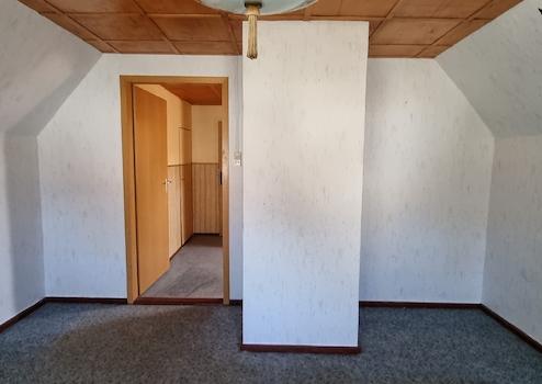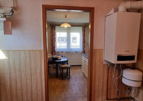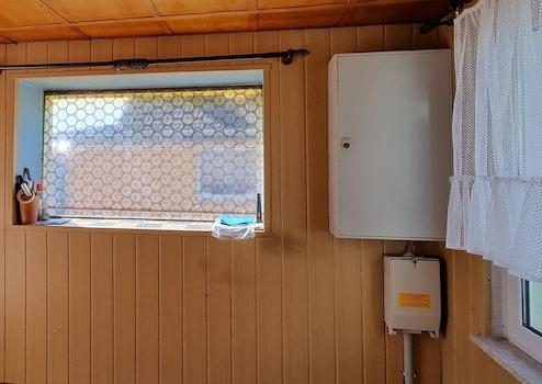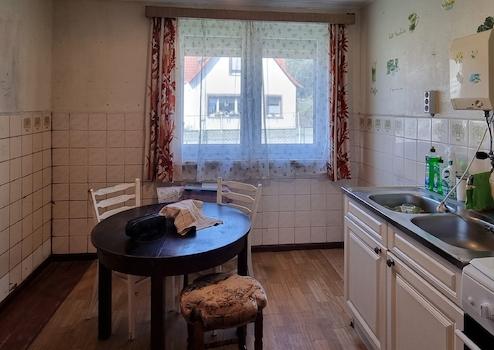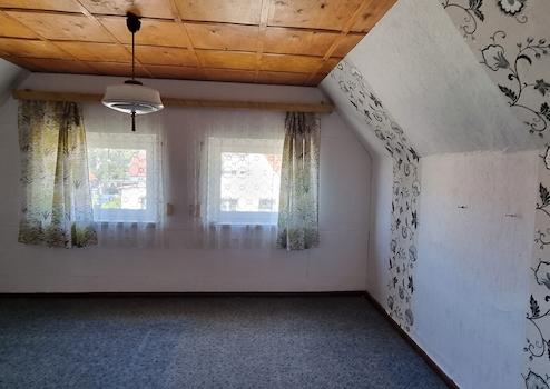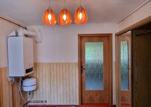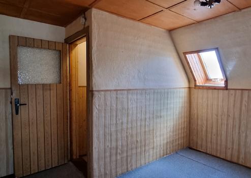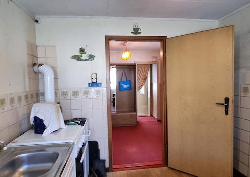 Im Erdgeschoss befinden sich die Veranda mit einem angrenzenden, kleinen Flur, von dem die Küche und 2 weitere Zimmer abgehen, etwas seitlich ist dann die Treppe zu dem Raum im Obergeschoss und der Durchgang zum Bad mit Wanne. Hinter dem Bad ist ein weiterer Raum. Er wird als Abstellraum genutzt. Im Bad selbst, ist noch der gute, alte Kachelofen im Einsatz, zu beheizen mit Kohle oder Holz. Wer öfter baden will, lässt ihn vielleicht - spart sicher manchen Euro. Für alle die lieber duschen, wäre sicher ein elektrischer Durchlauferhitzer sinnvoll. Im Sommer bleibt die Heizung dann aus, man benötigt keinen Speicher und hat heißes Wasser, wenn man es braucht. Momentan ist die Heizung nur für die Wärme der Zimmer verantwortlich.