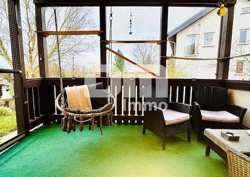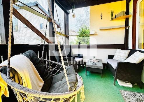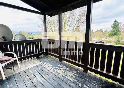 Vom Wohn- / Essbereich gelangen Sie auf den großen überdachten Balkon / Terrasse mit Zugang zum Gartenbereich hinter dem Wohnhaus.