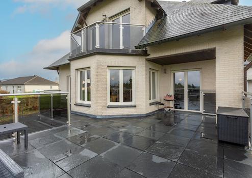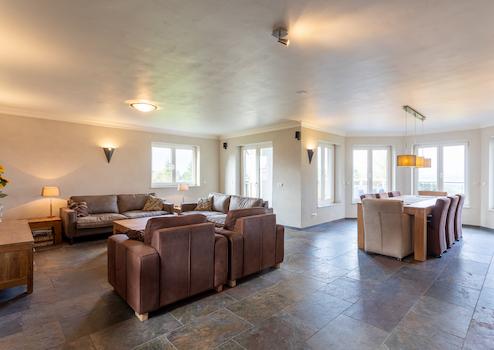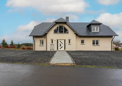 Das 2008 erbaute Anwesen besticht durch eine moderne und hochwertige Ausstattung. Beim Betreten der Villa empfängt Sie ein großzügiges, L-förmiges Wohnzimmer mit einem stilvollen Erker, der für reichlich Tageslicht und eine warme Atmosphäre sorgt. Das Haus verfügt über vier geräumige Schlafzimmer, davon eines im Erdgeschoss – ideal für Gäste oder für barrierefreies Wohnen. Drei luxuriös ausgestattete Badezimmer sorgen für zusätzlichen Komfort.