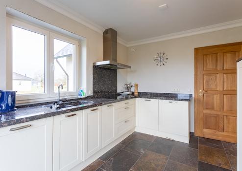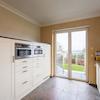 Geschlossene Küche mit Einbauküche inkl. 2 Kombi-Mikrowellen, Induktionskochfeld, Geschirrspüler, Kühlschrank, Gefrierschrank, Granitarbeitsplatte und Dunstabzugshaube. Vorratsraum und Zugang zur Terrasse.