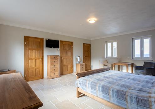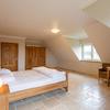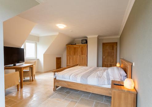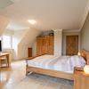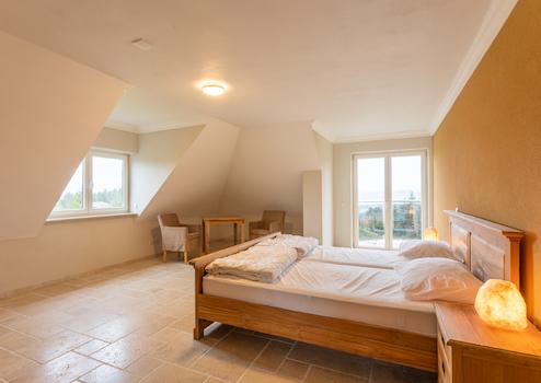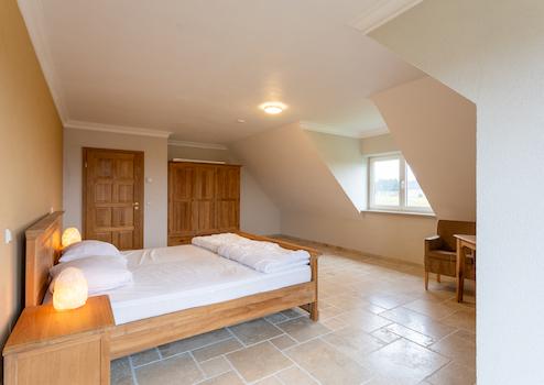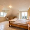 Schlafzimmer mit Gaube und Doppeltüren zum Balkon.
