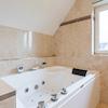 Badezimmer mit Whirlpool, ebenerdiger Dusche, Doppelwaschbecken und WC.