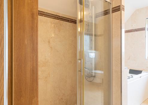 Hauptschlafzimmer mit begehbarem Kleiderschrank und eigenem 2. Badezimmer mit Dusche, Doppelwaschtisch und WC.