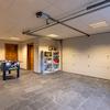 Geflieste Garage mit Fußbodenheizung und Platz für Waschmaschinen.