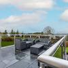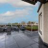 Große Terrasse hinter dem Wohnzimmer mit Edelstahl- und Glasgeländer und herrlichem Blick über die Landschaft.