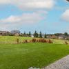 Garten mit Kunstgras, Hecken und Wegen, die mit Kies belegt sind.