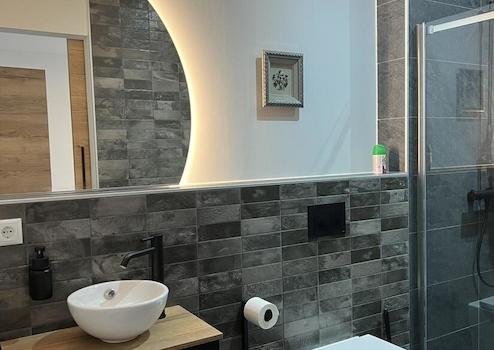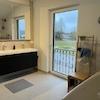 Das Badezimmer im Erdgeschoss ist mit bodentiefen Fenstern ausgestattet und sorgt für ein lichtdurchflutetes Ambiente.