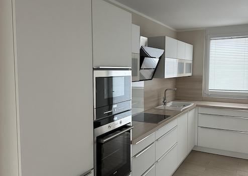 Küche: Moderne Luxus Einbauküche von Schüller mit Mattglasfronten und hochwertigen Siemens-Elektrogeräten für kulinarische Erlebnisse