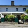 massiven Mauer begrenzt. Die Vorgartenfläche wird durch kleine Bäume und Büsche