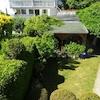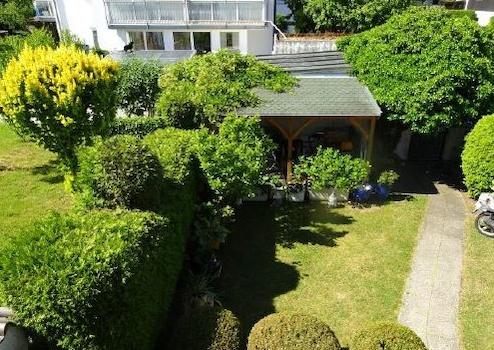 begrünt, der Garten ist mit Rasen und mit Büschen gestaltet. Die mit Betonplatten befestigte