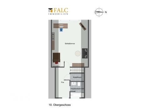 In der oberen Etage befindet sich ein großer, sehr heller Wohn-, Schlafbereich ebenfalls mit Klimaanlage, sowie ein Tageslicht-Bad mit Badewanne und ein Abstellraum, Der Wohn-, Schlafbereich und Flur sind mit Parkett ausgelegt, Bad und Abstellraum jeweils gefliest.