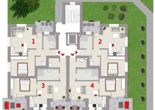 Im Erdgeschoss befinden sich vier 2-Zimmer Wohnungen mit Wohnflächen zwischen ca. 52 m² und ca. 58 m².