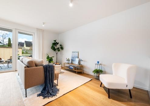 Die angebotene Wohnung Nr. 3 im Erdgeschoss verfügt über ca. 62,27 m² Wohnfläche, 2 Zimmer, ein modernes Tageslichtbad mit Dusche und einen Abstellraum im Untergeschoss. Zur Wohnung gehören außerdem eine Terrasse und ein Sondernutzungsrecht an einer Gartenfläche sowie ein Carport mit separater Abstellmöglichkeit.