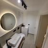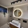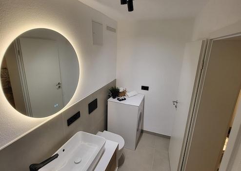 -Bad: sandfarbene Fliesen im Format 60x60, Armaturen von Hansgrohe in mattschwarz, Dusche, WC, Waschbecken inkl. Unterschrank, beleuchteter, Spiegel, Anschluss für Waschmaschine und Trockner. Sämtliche Wasserleitungen, die das Sondereigentum betreffen, wurden erneuert.