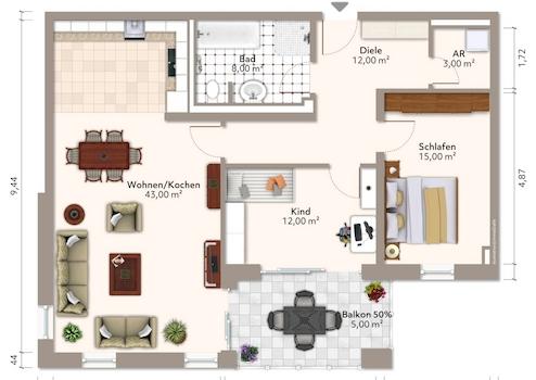 - offener Wohn- und Küchenbereich mit Zugang zum Balkon