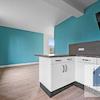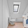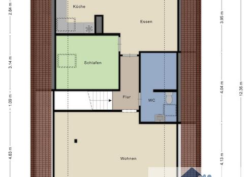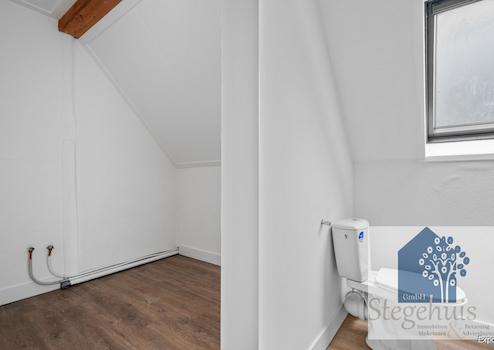 Flur, Elternschlafzimmer (zur Straßenseite), Toilette mit der Möglichkeit zur Installation einer Dusche, Kinderzimmer und ehemaliger Wohnessbereich der oberen Wohnung. Eine Einbauküche ist vorhanden.
