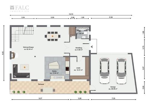 Über den Wohnbereich gelangen Sie auf die großzügig gestaltete Terrasse, von der aus Sie auch die massiv gebaute Doppelgarage mit elektrischen Sektionaltor sowie den Geräteschuppen erreichen.