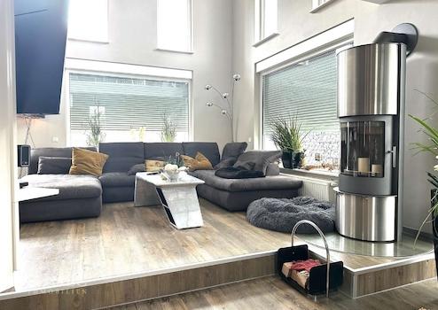 Das Untergeschoss ist komplett offen gehalten und bietet Ihnen neben einem gemütlichen Wohnbereich mit Designerkamin viel Platz für einen Essbereich, der perfekt von der offenen Küche zu erreichen ist.