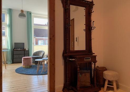 Die Etagenwohnung liegt im 3.OG eines Mehrfamilienhauses. In der Diele wird man von einer antiken Garderobe mit Spiegel empfangen.