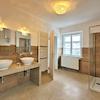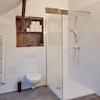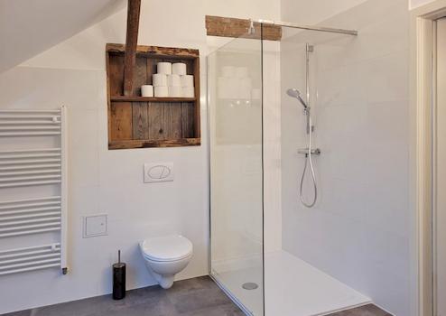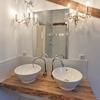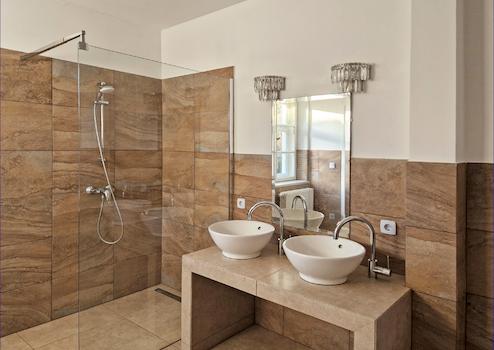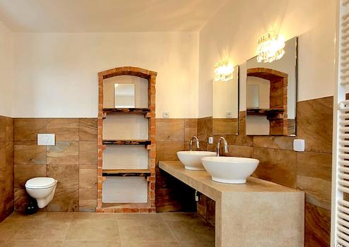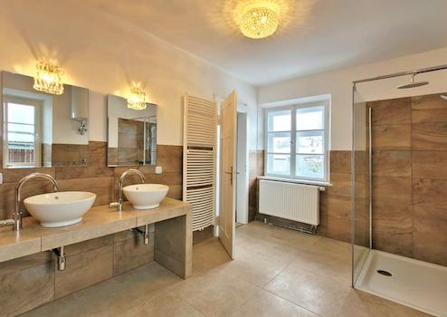 • Bad mit ebenerdiger Dusche, zwei Waschbecken, Toilette und Handtuchheizkörper