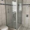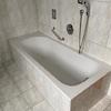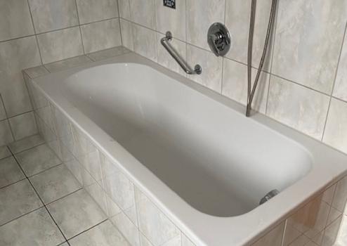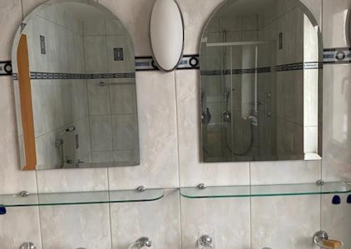 Das Badezimmer ist mit Dusche, Wanne, WC und zwei Waschbecken ausgestattet.
