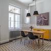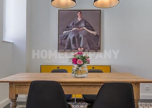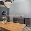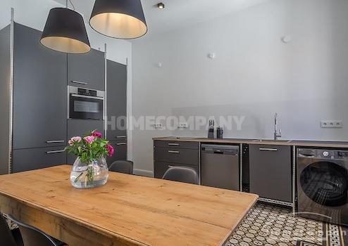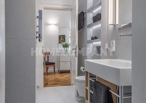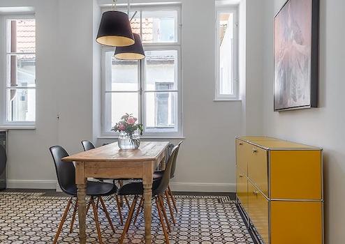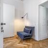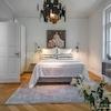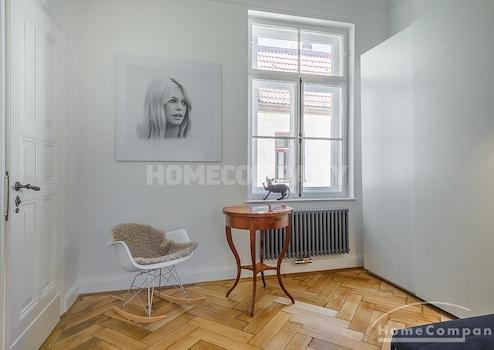 Schlafzimmer mit Doppelbett und Kleiderschrank, ruhig zum Innenhof ausgerichtet. Gästezimmer mit Einzelbettsofa, Schreibtisch und großem Schrank. Die separate, moderne Einbauküche verfügt über alles, was man täglich benötigt, z.B. Spülmaschine, Kaffeemaschine und verschiedenste Küchenutensilien; Essbereich für 4 Personen vorhanden. Das Wohnzimmer bietet ein edles Samtsofa, TV und Regalwand. Großzügiger Flur mit einem Mix aus Design-Klassikern und Antiquitäten. Modernes, stilvoll gefliestes Bad mit Dusche.