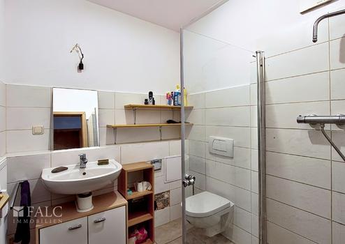 Das innenliegende Badezimmer ist mit einer großzügigen, ebenerdigen Dusche, einem Waschbecken und einem WC ausgestattet.