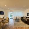 gemütliches Wohnzimmer mit Sofa, TV und Esstisch. Zugang zur Terrasse