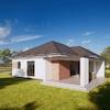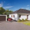 1-geschossiges Bungalow mit vier Zimmern, Garderobe, offener Küche, Bad, Gäste-WC, Technikraum und Diele.