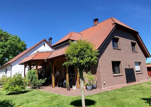 Diese ehemals rein landwirtschaftlich genutzte Hofanlage gliedert sich in ein saniertes Wohnhaus mit zwei großzügigen Wohnungen mit ca. 132 m² im EG und ca. ca. 183 m² Wohnfläche im OG. Angrenzend befindet sich der ehemalige Stall mit Zwischengebäude. Hier befinden sich diverse Wirtschaftsräume, die Heizung, eine schöne große Diele, sowie der große Garagenbereich mit drei elektrischen Toren. Angrenzend steht noch ein Anbau zur Verfügung, dieser wird derzeit als Lager und Werkstatt genutzt. Die Erdgeschosswohnung, 2015 saniert, ist modern ausgestattet und verfügt über ca. 132 m² Wohnfläche, aufgeteilt auf ein Wohnzimmer, zwei Schlafzimmer, ein großzügiges Badezimmer, Gäste-WC, eine schöne Wohnküche sowie einen zentralen Kaminofen auf der Diele.