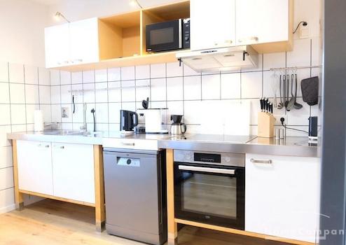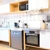 Die helle Einbauküche ist mit allem ausgestattet, was man zum Kochen und Speisen braucht: Geschirr, Gläser, Besteck, Mikrowelle, Induktionsfeld, Backofen, Geschirrspüler, Kühl-Gefrierkombi, Wasserkocher, Kaffeemaschine und vieles mehr.